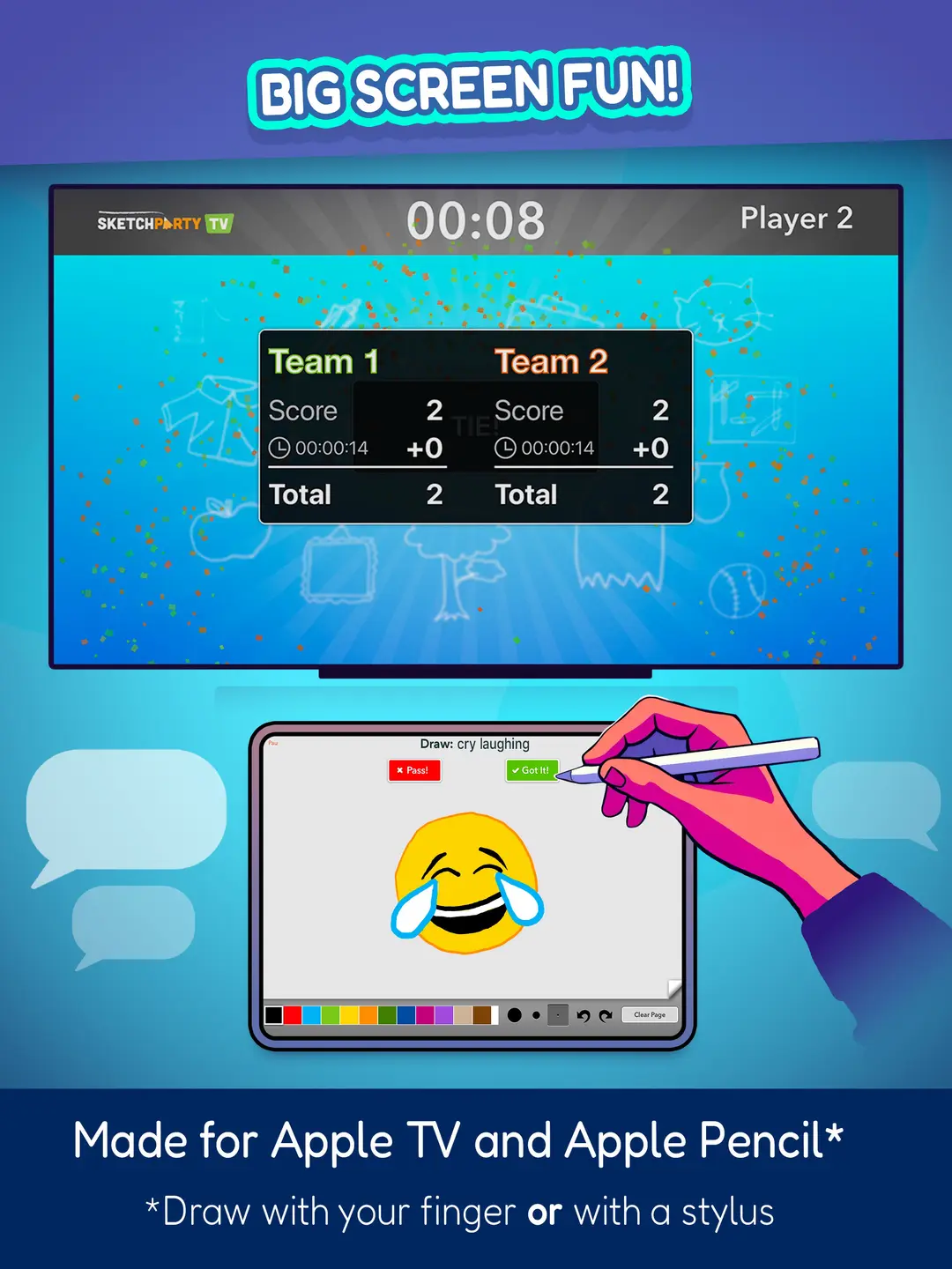 SketchParty TV is designed for your finger, but it plays great with a stylus. Like the Apple Pencil for pressure-sensitive drawing. Better drawings: better guesses.